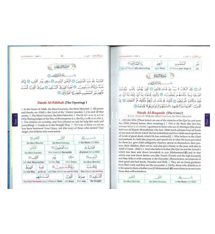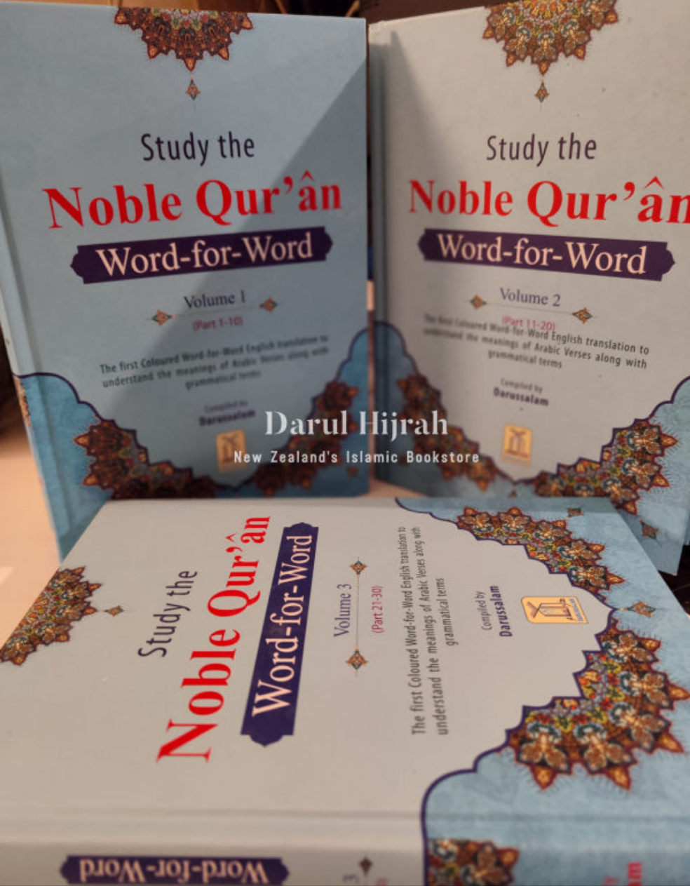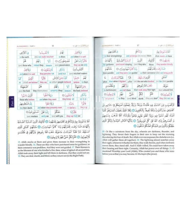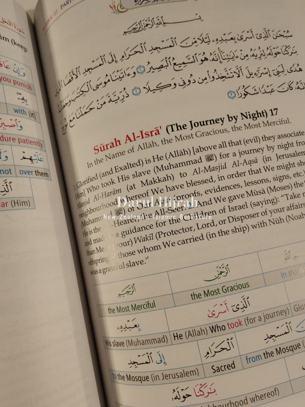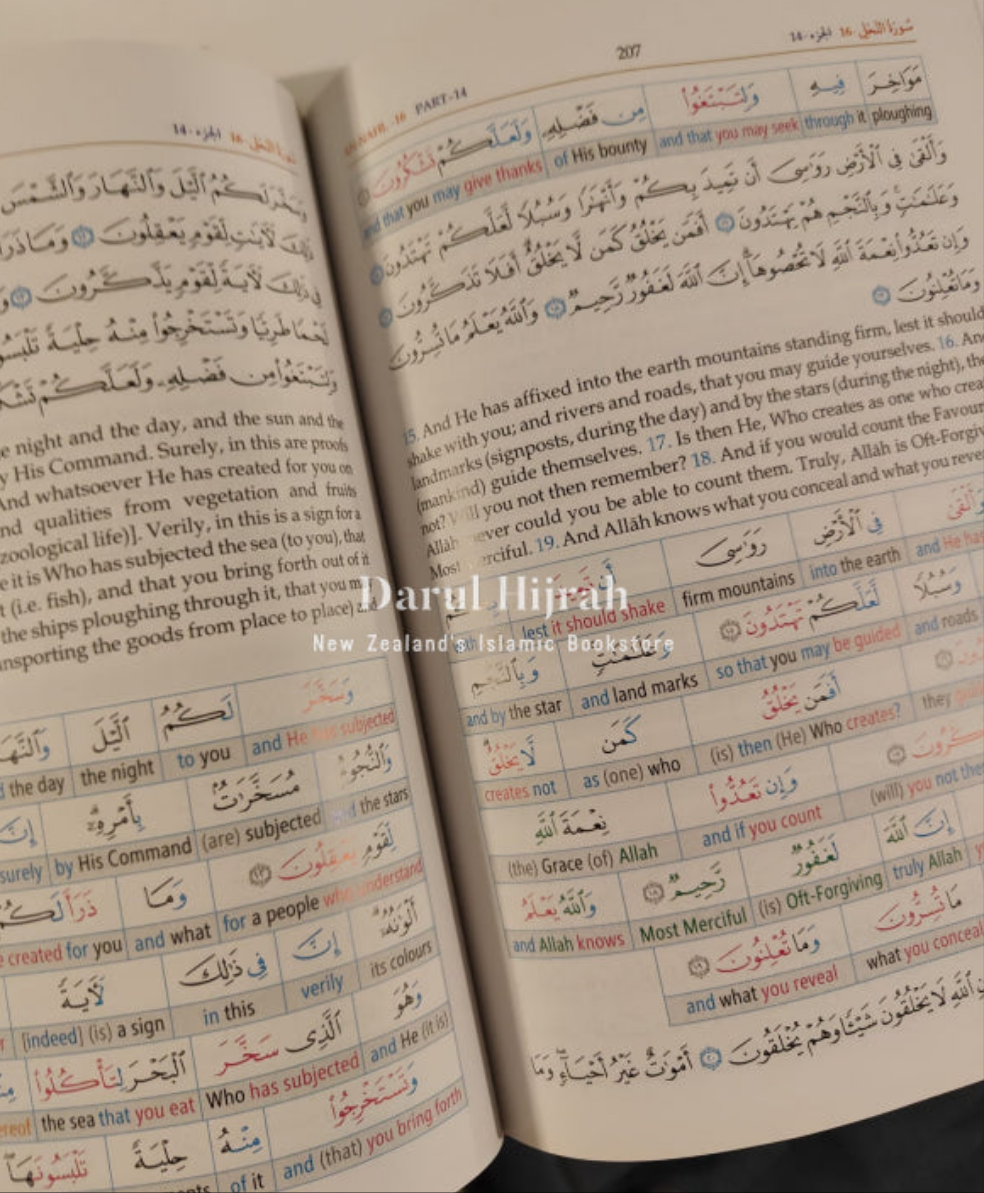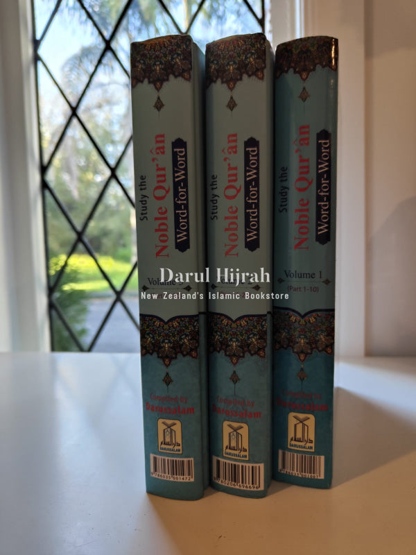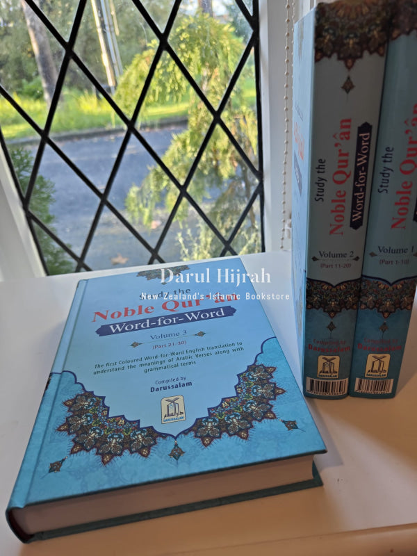 Discover the complete Qur'an in a vibrant three-volume set, now available in colour! This edition features a unique colour-coded word-for-word English translation, enabling a deeper understanding of the Arabic verses and grammatical terms. Each word is meticulously colour-coded alongside its meaning, helping readers grasp each verse's intricacies while comprehending text blocks. Explore both the literal and idiomatic translations on the same page, unravelling the layers of meaning within the Quranic verses. Compiled by Dar-us-Salam and translated by Dr. Muhammad Taqi-ud-Din Al-Hilali and Dr. Muhammad Muhsin Khan, this comprehensive edition offers a thorough approach to studying the Noble Quran.